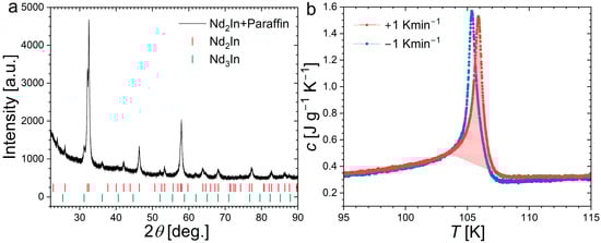 Panel (a): Powder X-ray diffraction pattern measured at room temperature on Nd2In powder dispersed in paraffin oil. The ticks mark out the reflections corresponding to Nd2In and Nd3In structures. Panel (b): specific heat of Nd2In recorded by a Peltier Cell Differential Scanning Calorimeter upon heating and cooling. The highlighted area corresponds to the integration of the transition entropy change.