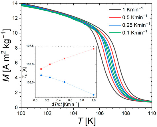 Figure 2 presents magnetization measurements as a function of the temperature near the Curie temperature of Nd2In. In line with former reports [4,5,17,18,19], a relatively sharp drop in magnetization is observed at about 108 K. As the present study is devoted to the main ferromagnetic transition in Nd2In, the comparatively minor magnetic anomaly usually observed at lower temperature is not investigated (spin reorientation transition near ~50 K) [17,18,19]. At the ferro–paramagnetic transition, a finite thermal hysteresis is observed between measurement upon heating and cooling. However, this dataset, recorded at different sweeping rates, successfully illustrates the difficulty of separating the intrinsic thermal hysteresis of the phase transition from the thermal lag inherent to dynamic measurements. At the lowest rate (0.1 Kmin−1), a finite thermal hysteresis δThyst ≈ 0.18 K is observed. This value turns out comparable with the exceptionally small hysteresis δThyst ≈ 0.1 K at the first-order ferromagnetic transition of Eu2In [13] and one order of magnitude smaller than typically observed in archetypical giant magnetocaloric materials with optimized hysteresis, such as La(Fe,Si)13 or MnFe(P,Si) [35,36,37].