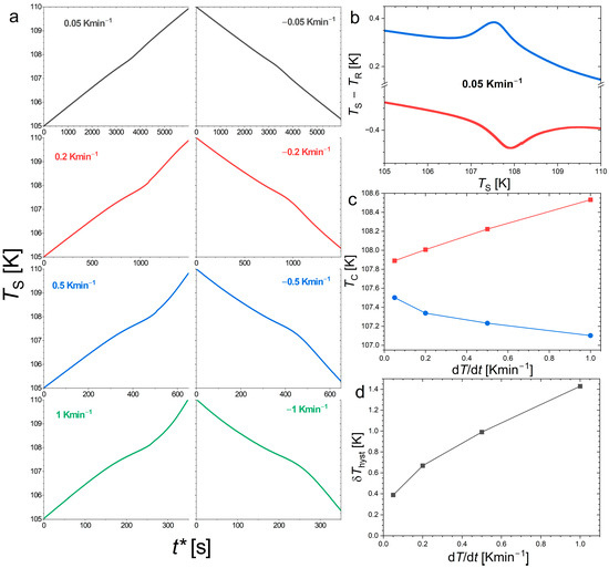 Thermal measurements carried out at different sweeping rates at the ferromagnetic transition of Nd2In. (a) Sample temperature (TS) thermograms recorded in DTA upon heating (left) and cooling (right), with the time axis presented as t* = t − t (T = 105 K) and t* = t − t (T = 110 K), respectively. (b) DTA signal at the slowest sweeping rate of ±0.05 Kmin−1 upon heating (bottom) and cooling (top). (c) Transition temperature upon heating (squares) and cooling (circles) determined as dT/dt minima on the thermograms. (d) Thermal hysteresis determined from the difference in transition temperatures.