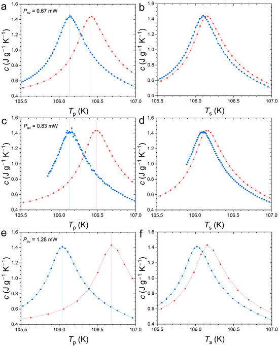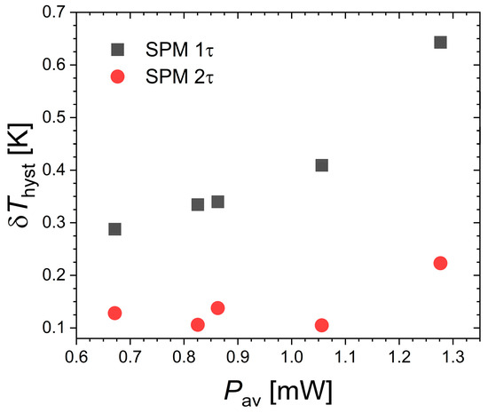 Figure 4 presents the specific heat peak measured by SPM at the Curie temperature of Nd2In. First, one can note that the thermal anomaly associated with the FOMT is relatively successfully captured by the SPM method, as it yields a peak maximum of ~1.5 J g−1 K−1 comparable to DSC measurements presented in Figure 1. We also observe that the peak marking the transition is rather symmetric. A Gaussian distribution of latent heat centered on the transition temperature is typical of first-order transitions and contrasts with the lambda-like anomaly of second-order transitions. The improved temperature resolution offered by SPM allows us to accurately describe the specific heat event, which may explain the difference compared to the original report on Nd2In concluding on a lambda-like anomaly [15]. When analyzed in a 1τ model considering the sample and platform as a single system in perfect thermal contact, the specific heat is expressed as a function of the platform temperature (TP). By selecting a different bath temperature (T0) and targeted pulse temperature range, different amounts of heat power can be applied. Increased heat power leads to a faster crossing of the transition and also results in an apparent increase in thermal hysteresis between the peak upon heating and cooling as a function of TP, corresponding to δThyst in the range 0.29 to 0.64 K for the explored SPM parameters.
