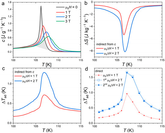 Figure 6 presents measurements of the specific heat in applied magnetic fields and the corresponding determination of the magnetocaloric effect as well as a comparison with direct ΔTad measurements. The transition entropy change was estimated by integration of the specific heat using a linear background yielding a value 10.8 J kg−1 K−1. A comparable estimate (10.9 J kg−1 K−1) was obtained using DSC data, as shown in Figure 1, which confirms the reliability of the present specific heat data even at the FOMT. In addition to measurement techniques, estimating the transition entropy is actually made tricky by the selection of the starting and end points of the transition. Here, even when considering a temperature window of 4 K, which is relatively large with regard to the ~0.7 K full width at half maximum of the peak, the ΔStr in Nd2In appears thrice smaller than that found in orthorhombic Eu2In (ΔStr ≈ 27.5 J kg−1 K−1 [13]) indicating a significantly weaker FOMT.