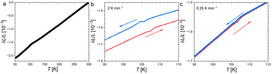 Dilatometry measurements were carried out using a homemade strain gauge option. ZEMIC BAB-120-3AA250(11) (Xi’an, China) strain gauges were bonded with H-610 epoxy on a polished 9 × 9 × 5 mm3 bulk piece of Nd2In and a fused silica reference sample. A Keithley 2400 source meter unit was used for the voltage excitation of the Wheatstone bridge and a Keithley 2182A nanovoltmeter was employed to record the output voltage signal; both were controlled via a 2018LabVIEW interface (Tektronix, OR, USA). Prior to the measurement, a Cu metal reference (Puratronic, 99.999%, Alfa Aesar, MA, USA) was measured by using gauges originating from the same batch (and the same glue). At T = 293 K, the measured linear thermal expansion for the cupper, 16.8 ppmK−1, was in line with the expected value and over the whole temperature range (50–350 K), deviations from the NIST reference values did not exceed 2.5%.