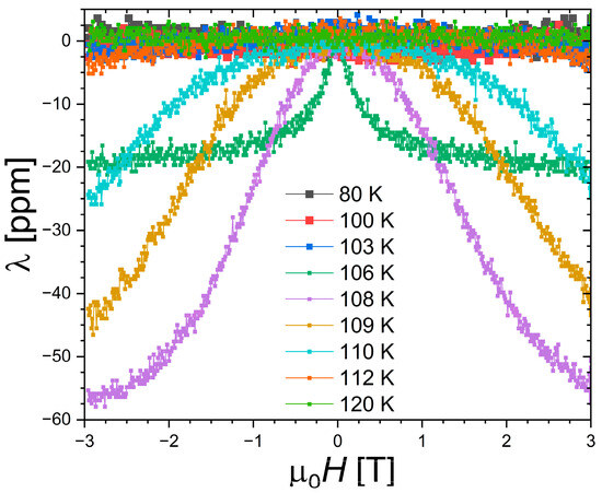 Longitudinal magnetostriction measurements were carried out at selected temperatures, below, at, and above the ferromagnetic transition. In the ferromagnetic state, the forced magnetostriction is small (≈2 ppm for 3 T at 80 K). A finite negative longitudinal magnetostriction appears near the phase transition, with an S-shape just above TC, mimicking the magnetization of a field-induced FOMTs. This magnetostriction quickly vanishes when the temperature is raised (or requires significantly larger magnetic field to be induced), and become negligible (≤1 ppm) in the paramagnetic state above 120 K. Qualitatively, the presently observed temperature dependence of the magnetostriction is in overall agreement with the former two reports [17,18]. Quantitatively, however, one can note some notable differences. In ref. [18] employing strain measurements as a function of the temperature in different magnetic fields, a negative magnetostriction was observed only in applied fields of 8 T and more. Here, finite negative magnetostriction is observed at intermediate fields of 1 or 2 T during isothermal measurements. Differences in thermalization might influence the observation of subtle magnetostrictive features. With a progressive saturation just above TC at −58 ppm for 3 T, the amplitude presently observed is significantly smaller than the giant saturation magnetostriction of ~450 ppm reported in ref. [17].
