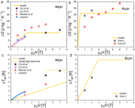 Among the various approaches which can be used to predict the magnetocaloric effect, a parametric “latent heat” method can appropriately describe the giant magnetocaloric effect with FOMT. This model consists of describing the shift in the entropy discontinuity of a FOMT due to the application of a magnetic field [43,44,45,46,47,48]. At high magnetic fields, when the transition is fully induced, ΔS corresponds to the entropy change in the transition ΔS = ΔStr and correspondingly ΔTad = TCΔStr/cback, where cback is the specific heat background outside the transition. Below their respective saturating fields, ΔS = ΔStr[ΔH(dTtr/dH)]/δTtr and ΔTad = ΔH(dTtr/dH)[1 − δTtr/(ΔStr/cback + δTtr)] are dependent on the magnetic field change (ΔH) and can be expressed as a function of several externally measured parameters such as the shift in the transition due to field (dTtr/µ0dH) or the width of the transition (δTtr) [43,44,45,46,47,48]. While it is advantageous to describe giant MCEs, this model neglects the magnetocaloric contributions that do not originate from the FOMT (the magnetocaloric effect due to application of the field on the paramagnetic and ferromagnetic fractions below and above the FOMT). Table 1 summarizes the parameters used to model Nd2In and Eu2In in Figure 9.