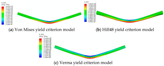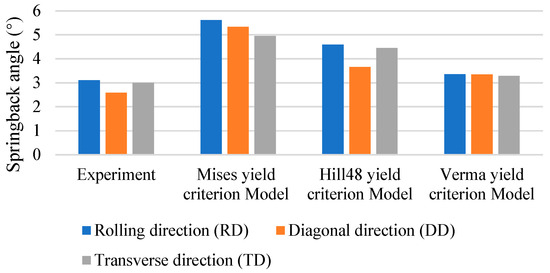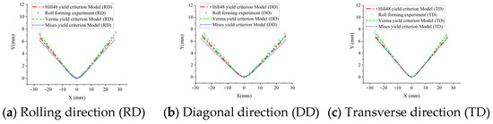 - Compared with the von Mises and Hill48 yield criterion FEM models which ignore the tension–compression asymmetry, the final cross-sections calculated with the Verma yield criterion FEM model (Error: 8.04%) are much closer to the roll-forming experimental results than those from the von Mises yield criterion FEM model (80.7%) and Hill48 yield criterion FEM model (47.59%). This demonstrates that the proposed FEM modeling method based on the Verma yield criterion is reliable in magnesium alloy roll-forming and springback simulations. In roll forming, the tensile and compressive deformation amount is substantial. The results highlight the importance of considering tension–compression asymmetry in magnesium alloys roll forming for the first time, and they also emphasize the importance of adopting the proper yield criterion that can reflect the asymmetric yield behaviors in the magnesium alloy forming and springback predictions.