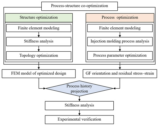 As mentioned above, apart from the structural design, the warpage, residual stress–strain, and fiber orientation induced by injection molding significantly could significantly affect the structural performance, and these factors also impact the accuracy of performance evaluations. Therefore, it is essential to establish a process–structure co-optimization approach for GFRP components. This study focuses on a GFRP front-end module, where structural optimization is employed to enhance the stiffness of key mounting points, followed by injection molding process optimization through injection molding simulation based on an orthogonal experiment, and service performance evaluation by mapping injection molding history to structural mechanics simulation. The flowchart of the methodology proposed is illustrated in Figure 1, which can provide technical support for the design and performance evaluation of GFRP automotive body structures.