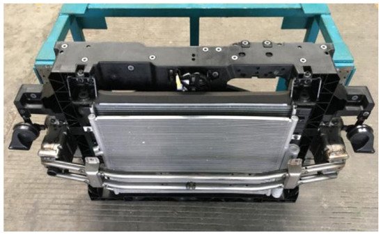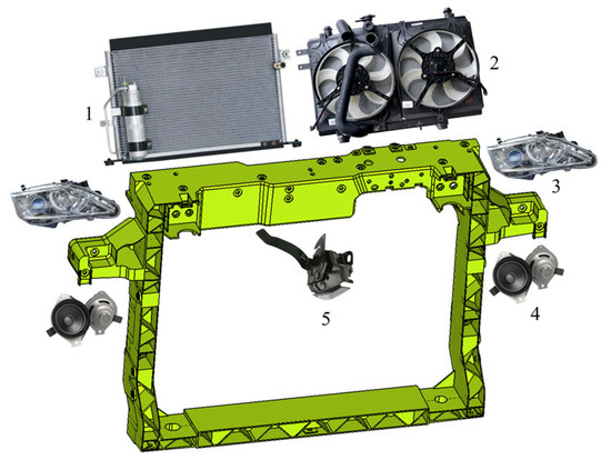 The front-end module mainly integrates components such as hood latch, headlight, radiator, and horn, as shown in Figure 2. These mounting points need to possess sufficient stiffness to withstand road bumps, interference induced by shaking, abnormal vibration noise, and other issues, with specific stiffness indexes listed in Table 1. In-mold assembly molding process is adopted for the GFRP front-end module, which involves precisely positioning pre-stamped metal parts inside its injection molds, using high-pressure injection molding to encapsulate the metal inserts with molten plastic. After cooling and solidification, a metal–plastic integrated structure is formed. Compared to traditional stamping-welding and pure injection molding, this method not only delivers higher dimensional stability and superior mechanical performance but also achieves a weight reduction of over 40% compared to traditional steel components [41,42].