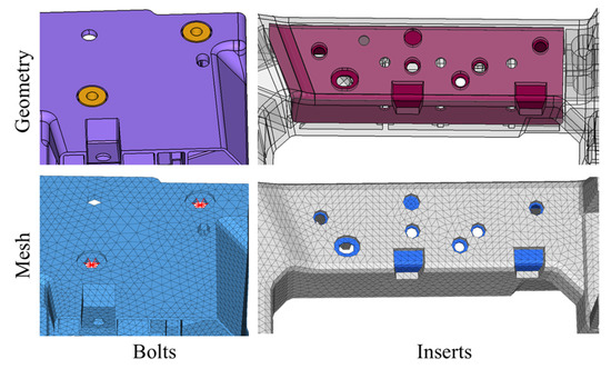 Before meshing, geometric preprocessing is required to ensure mesh quality. First, import the CATIA model into Hypermesh 2022.1 and remove fillets and steps smaller than 0.3 mm. Then, perform meshing using C3D10 tetrahedral elements to accurately represent thickness variation and complex geometry while preventing over-stiffness in the simulation. The bolts and inserts are molded into the front-end module via in-mold injection, exhibiting elastic modulus two orders higher than that of GFRP. For finite element modeling, the bolt holes are treated with coupling constraints, while all contact surfaces between the inserts and the GFRP body employ shared-node meshing, as shown in Figure 3. A global mesh size of 5 mm is adopted, resulting in a total of 327,466 elements with minimum element size of 0.8 mm. The GFRP front-end module utilizes PP + LGF40 material, which is characterized by the addition of 40% long glass fiber in PP material [43]. GFRP is conventionally treated as isotropic, requiring only three fundamental parameters for stiffness simulation: elastic modulus (5240 MPa), Poisson’s ratio (0.34), and density (1.22 × 10−9 ton/mm3).