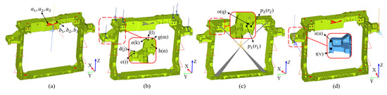 A 1000 N load is applied in the vehicle’s +X and ±Z directions on the latch mounting points. The right-side measurement points include (+X), (+Z) and (−Z), with left-side symmetrical points (+X), (+Z) and (−Z), as illustrated in Figure 4a. A 100 N load is applied along the +X and −Z directions on the headlight mounting points. The right-side measurement points are d/e/g (+X) and c/f/h (−Z), with symmetrical left-side points j/k/m (+X) and i/l/n (−Z), as shown in Figure 4b. Due to the extremely high elastic modulus of aluminum alloy (70 GPa) as compared to GFRP, the mounting points of the aluminum alloy radiator are rigidly coupled to its centroid using coupling constraints, followed by loading of 600 N in the ±X and −Z directions. The measurement points include o (−Z) and / (+X) on the right side, with symmetrical points q (−Z) and / (+X) on the left side, as depicted in Figure 4c. For the horn mounting points, a 300 N load is applied along the +X and −Z directions. The right-side measurement points are s (−Z) and t (+X), with corresponding left-side points u (−Z) and v (+X), as shown in Figure 4d.