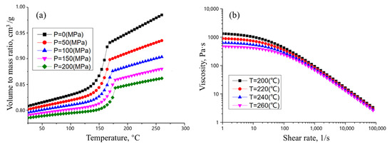 PVT curves of PP + LGF40 GFRP under varying injection pressures (a) and viscosity–shear rate curves at different temperatures (b).
