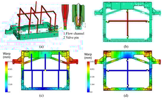 Simulation models and warpage distribution results: (a,c) sequential valve injection; (b,d) conventional simultaneous injection.