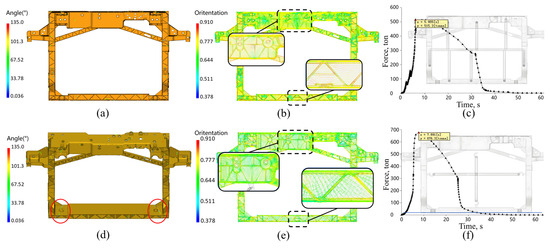 Simulation results using (a–c) sequential valve injection; (d–f) conventional simultaneous injection: (a,d) weld line distribution; (b,e) fiber orientation tensor; (c,f) injection pressure.