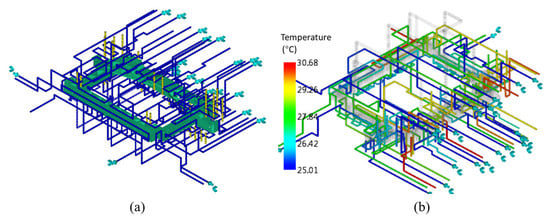 After comprehensive evaluation, the sequential valve control of case 1 is ultimately adopted, with well-defined time for filling and packing. However, the cooling stage—from the end of packing to mold opening—accounts for over 50% of the total cycle time. Therefore, to enhance production efficiency, it is essential to optimize the cooling system, especially the layout of cooling channels. The cooling channel design must holistically balance cooling efficiency, mold structural compatibility, and manufacturability. Without interfering with other component arrangements, the optimized cooling system shown in Figure 9a is optimally designed based on the front-end module structure and gating system, with the temperature distribution at the moment of the maximum inlet–outlet temperature difference shown in Figure 9b. Clearly, the maximum temperature difference is less than 5 °C, indicating that the temperature difference between the inlet and outlet remains stable within 5 °C throughout the entire cooling process, fully complying with cooling process specifications while delivering a superior cooling performance.