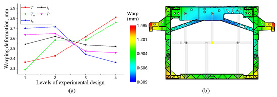 Figure 10a shows the influence of process parameters on warpage. It can be found that , and are the primary factors affecting warpage, ranked in descending order as > > > > . Under current experimental conditions, the optimal process parameter combination is determined to be = 20 °C, = 210 °C, = 90% = 6 s, and = 25 s. Simulation employing the optimized process parameter combination is conducted. The result shows that the warpage is significantly reduced to 1.498 mm. Compared with the average warpage from the 16 sets of orthogonal experiments, the optimal parameter combination represents a reduction of 41.5% in warpage, which can provide a reliable theoretical basis and technical guidance for injection molding process setting in actual production.