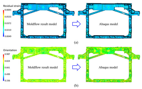 Firstly, the filling, packing, and warpage of the front-end module are simulated using Moldflow software based on the obtained Ramberg–Osgood curve, with resulting files then exported to Autodesk Helius PFA. The simulation outputs include five file formats: (1) SDY—computational input file containing model mesh, nodal data, boundary condition, processing setting, and material property; (2) LSP—resulting files storing layer-specific stress field, thermal property, and mechanical performance data; (3) OF1—complete filling simulation results excluding weld line and air entrapment; (4) OO1—fiber orientation distribution results; (5) WS3—weld interface data. Subsequently, the input and output files from Moldflow simulation are imported along with the stiffness simulation input file (.inp) from Abaqus into the Advanced Material Exchange module of Autodesk Helius PFA, while simultaneously aligning the Moldflow model with the Abaqus model. Finally, mapping the fiber orientation and residual stress–strain distribution onto the structural simulation model of Abaqus. The distributions of fiber orientation tensor and residual strain, as well as the corresponding Abaqus model after injection molding history mapping, are shown in Figure 12. In the mapped Abaqus model, each finite element is assigned a unique material property corresponding to the manufacturing-induced variations. This methodology bridges a relationship between process and service performance by maintaining traceability from injection molding parameters to mechanical behavior.