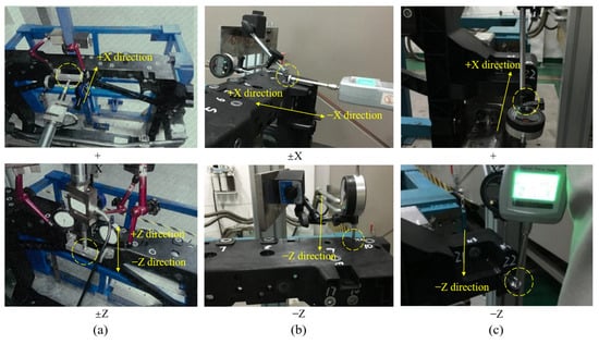 It should be noted that the stiffness tests for the latch and radiator mounting points are conducted on an electric servo test system, while the headlight and horn mounting points are tested using a handheld force measurement device. Displacement measurements for all tests are performed using a digital displacement gauge. The digital displacement gauge is fixed on the test rig using a universal bracket to ensure it is unaffected by the loading process during testing. All loads are applied as concentrated forces, progressively increasing from 0 N to the designed values, maintained at peak for 10 s, with the maximum displacements recorded by the digital displacement gauge. The mounting point stiffness tests for the latch, headlight, and horn are illustrated in Figure 14, with the statistical results of the maximum displacement listed in Table 2.