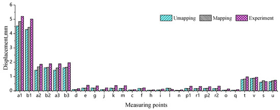 Comparison between simulated and experimental displacements at each measurement point under different conditions.