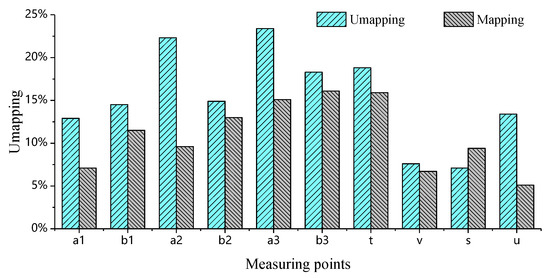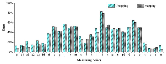 The errors between simulations (both with and without injection molding history mapping) and measurements are calculated using Equation (2), with the statistical results shown in Figure 16. It can be observed that when the experimentally measured displacements are small, both simulation approaches exhibit significant deviations from the test results, with maximum reaching 83% and 79%, respectively. It is particularly noteworthy that when the control limit at the mounting points is below 0.40 mm, the corresponding average percentage errors reach 47.9% and 48.0%, respectively. Such large margins of error render these measurements unreliable for reference purposes. These demonstrate that, under the inherent presence of systematic errors, when experimental measurements are sufficiently small, the discrepancies between simulation and test results remain significant regardless of whether the injection molding history is mapped or not. From an engineering standpoint, these values are negligible in magnitude and maintain substantial margins from evaluation thresholds, thus failing to qualify as valid indicators for assessing simulation accuracy. However, when the measured displacement exceeds 0.65 mm, the percentage errors between the experimental results and both unmapped and injection-molding-history-mapped simulations decrease significantly, as illustrated in Figure 17. Here, the maximum values are 23.49% (unmapped) and 19.14% (mapped), while the minimum dropped to 7.08% and 5.14%, respectively. The average further decreases from 15.36% (unmapped) to 11.78% (mapped).