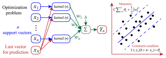 where N represents the number of data points. represents the distance between the n-th data point and its margin hyperplane. w and b are the normal vector and bias of the hyperplane, respectively. and belong to the dataset consisting of N samples. In this paper, the RBF with a key inner parameter (g) was combined with the SVR model to minimize the prediction errors.