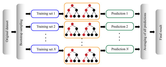 RF is an ensemble learning method that improves the stability and accuracy of a model by constructing multiple decision trees (DTs) and averaging their prediction results (see Figure 3). During model training, samples were selected from the database to establish a DT according to the sampling with replacement (i.e., the Bootstrap rule), and features were randomly selected at each node split, which increases model diversity and reduces the overfitting risk. For the RF model, the selection of the number of trees (Nt) and minimum leaf point (Minleafsize) significantly impacts the model’s prediction accuracy. The former is closely related to model stability and computational efficiency, while the latter influences the data fitting process. In general, RF models are widely used for regression problems due to their strong performance in handling nonlinear relationships and feature redundancy [42].
