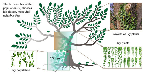 The Ivy algorithm was developed by Ghasemi et al. [43] to solve various optimization problems, inspired by simulating the life stages (e.g., growing, rising, and spreading) of ivy plants. The algorithm establishes mathematical and experimental models based on the growth rate of ivy plants, determines the growth direction using ivy plant knowledge, and mimics the plant’s behavior through a self-improvement mechanism. Optimization tasks using this algorithm generally follow the following steps: