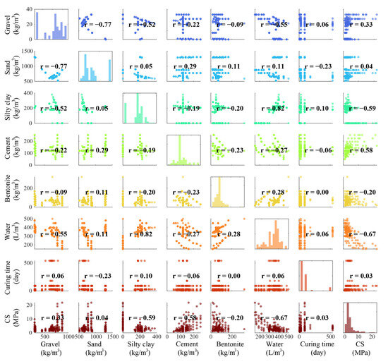 As mentioned in Section 1, several parameters (such as gravel, sand, cement, water, and bentonite) have a significant effect on BPC’s performance, especially its CS. To construct a high-performance model and determine the influence of these parameters on the CS of BPC materials, a dataset consisting of 169 samples developed by Amlashi et al. [37] was utilized to generate prediction models. This dataset includes seven parameters, i.e., gravel, sand, silty clay, cement, water, bentonite, water, and curing time, which were considered as input features to train the models for predicting CS. The statistical results of these features are illustrated in Table 1. Furthermore, the correlation between features needs to be calculated to remove features that negatively affect model performance [47]. Therefore, the Pearson correlation coefficient method was used to calculate the linear correlations between the features (see Figure 5). As shown in this picture, the highest correlation coefficient between input features is −0.77, and the lowest value is zero. These results suggest that the influence of each input feature on the prediction target (i.e., CS) is independent. Moreover, the correlation coefficients between silty clay (−0.59) and cement (0.58) and the CS are significantly higher than those between the other features and the CS. In general, all selected features are considered relevant for the subsequent model development.