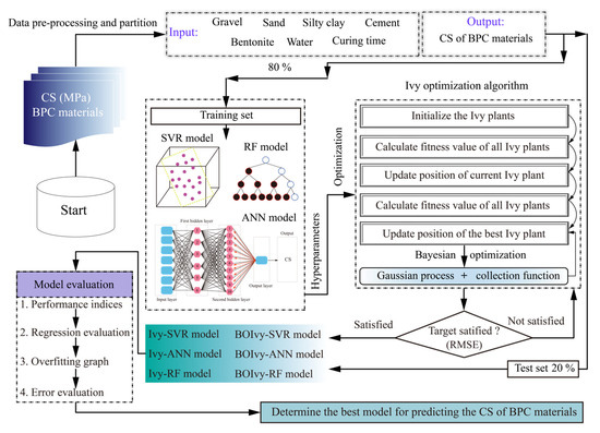In this paper, three ML models (SVR, ANN, and RF) were developed using 169 samples to predict the CS of BPC materials. To further improve the prediction accuracy of models, the initial Ivy algorithm and its variant optimized by BO were utilized to select the best combinations of hyperparameters for all models. As illustrated in Figure 6, the whole process of developing the prediction models can be divided into the following steps: