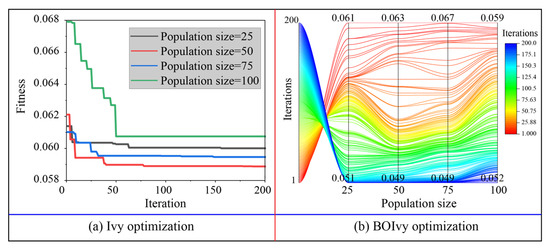 The optimization results for the three models predicting the CS of BPC materials based on the training set are demonstrated in Figure 7, Figure 8 and Figure 9. For the SVR models, the minimum fitness values of all models optimized by Ivy with different population sizes were obtained before reaching the maximum number of iterations. Among these hybrid Ivy-SVR models, the model optimized by the Ivy algorithm with 50 ivy plants obtained the lowest fitness value during 200 iterations (see Figure 7a). On the other hand, the fitness values of all SVR models decreased when using the BOIvy algorithm to select the optimal combinations of hyperparameters. As shown in Figure 7b, the model optimized by the BOIvy algorithm with 75 ivy plants achieved the lowest fitness value after 200 iterations. Furthermore, the iteration curves of the ANN models optimized using the Ivy and BOIvy algorithms are illustrated in Figure 8. It can be observed that the Ivy-ANN model with a population size of 50 resulted in a lower fitness value compared to other models with population sizes of 25, 75, and 100. Similarly, the fitness values of ANN models optimized by the BOIvy algorithm were lower than those of the Ivy-ANN models. Additionally, Figure 9 shows the iteration curves of RF models optimized using both the Ivy and BOIvy algorithms. It can be seen that the minimum fitness values of the Ivy-RF or BOIvy-RF models with population sizes of 50 and 100 are close to and lower than those of the other models. As demonstrated in Table 3 and Table 4, when the population size is fixed, the SVR models consistently show lower fitness values than the other two types of models, especially the RF models. Overall, the optimization results indicate that using BO to improve the initial Ivy algorithm is beneficial for finding the best hyperparameter combinations for each model. As a result, the optimal hyperparameters of the SVR, ANN, and RF models determined by the Ivy and BOIvy algorithms are listed in Table 5.