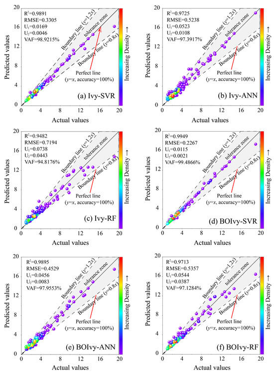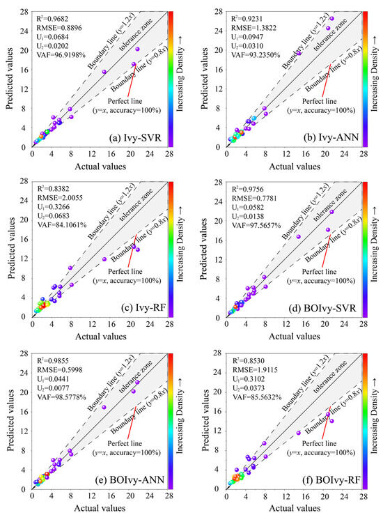 Furthermore, a regression graph was generated to evaluate model performance by comparing the difference between the actual and predicted CS values. In this graph, the position of each data point is determined by the actual and predicted CS values. If the actual value matches the predicted CS value, the data point lies on the diagonal (y = x). Otherwise, the data points are distributed around the diagonal according to the degree of difference. Since most predictions inevitably involve some degree of error, this study introduces two boundary lines (y = 1.2x and y = 0.8x) to define an acceptable error region, referred to as the tolerance zone. Data points falling far outside this region are considered to result from low-quality predictions. Therefore, the number of points located within the tolerance zone and closer to the diagonal line serves as a key indicator for evaluating the model’s predictive performance. As shown in Figure 10a–c, most of the data points obtained by the Ivy-SVR model are located near the diagonal line and its adjacent areas. Some data points obtained by the Ivy-ANN model are farther from the diagonal line but still within the tolerance zone. However, most data points from the Ivy-RF model are scattered, with some values even exceeding the tolerance zone. The regression graph and the performance evaluation results of Ivy-based models are highly similar to those obtained by BOIvy-based models (see Figure 10d–f).
