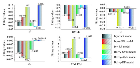 Additionally, a fitting evaluation graph was constructed to show the performance difference between the model on the training set and the test set. Typically, the error between the evaluation indices of the model on the training set and the test set serves as the fitting evaluation index. Assuming that the model performs well on the training set, then an error equal to zero indicates that the model has neither underfit nor overfit and can be considered the best prediction model [54,55,56]. In this paper, five statistical indices, including R2, RMSE, U1, U2, and VAF, were used to generate five fitting evaluation graphs, as shown in Figure 12. It can be observed that the BOIvy-ANN model has the best performance in all fitting evaluations, i.e., the smallest errors in all five evaluation indices (R2: −0.006, RMSE: −0.1469, U1: 0.0015, U2: 6 × 10−4, and VAF: −0.6225). In contrast, the Ivy-RF model exhibits significant overfitting compared to other models, with R2 of −0.11, RMSE of −1.2861, U1 of −0.2528, U2 of −0.024, and VAF of 10.7115.