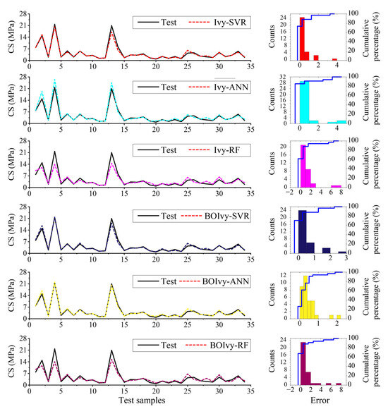 Next, error analysis was conducted to determine the best model for predicting the CS of BPC materials. Curves of the actual and predicted CS for all models are shown in Figure 13. It can be observed that the curves of the actual and predicted values align well in most areas, indicating that the predictive performance of the developed models is generally acceptable. However, most models showed high error predictions for the 4th, 14th, and 25th samples. On the other hand, for the BOIvy-ANN and BOIvy-SVR models, the curves of the predicted and actual values closely coincide, which suggests that their prediction performance is superior to that of the other models. The results of statistical error analysis are presented in Table 8. It can be observed that the Ivy-RF and BOIvy-RF models yielded the highest errors, with maximum errors exceeding 7 and the total errors surpassing 37. In contrast, the BOIvy-ANN model exhibited the smallest maximum error of only 2.0187, and its total errors were under 15. Therefore, the BOIvy-ANN was considered the optimal model for predicting the CS of BPC materials.