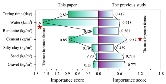 Although the optimal prediction model was determined, the influence of features on the CS prediction remained unclear. In other words, the model functioned as a “black box” and could not be transparently applied in practical projects. To address this, sensitivity analysis was carried out to calculate the importance score of each feature for predicting the target. Figure 14 demonstrates the results of the importance calculation for each feature based on the optimal model (the BOIvy-ANN model). It can be seen that water received the highest importance score (1.6) among all features. Following this, curing time and cement also had relatively high importance scores compared to the other features. However, in a previous study by Amlashi et al. [37], cement was identified as the most important feature for predicting the CS of BPC materials. The difference in conclusions between the two studies can be attributed to the variation in data sequences and the selection of hyperparameters used in modeling, which likely influenced the importance of each feature in predicting the same target.
