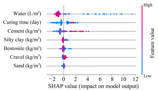 On the other hand, understanding the contribution of features to CS prediction is essential for optimizing the design of BPC materials. To achieve this, the Shapley additive explanation (SHAP) analysis was conducted. As shown in Figure 15, the points with colors from blue to red represent the values of features from low to high. When blue points are located in the positive SHAP value region, the corresponding feature exhibits a negative correlation with the predictive target. Conversely, features with red points in the positive SHAP value region indicate a positive correlation with the target. Based on the results of the SHAP analysis, water, silty clay, and bentonite provide negative contributions to CS prediction, and the other features are positively correlated with CS, especially curing time and cement.