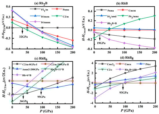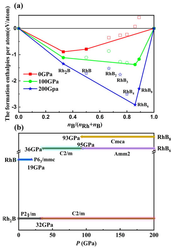 Here, H (RhxBy), H (Rh), and H (B) are the enthalpies of RhxBy, Rh, and B, respectively. The cubic phase of Rh [37] and the hexagonal α-B [38] are established as the referential phases. Based on the definition of formation enthalpies of Rh-B compounds, the phase stabilities of various stoichiometries in the Rh-B system are displayed in Figure 1a, in which the convex hull is constructed relative to solid Rh and B. The dots on the solid line indicate thermodynamic stability, while the hollow symbols above the convex hull represent metastable structures in the Rh-B system. The most stable structure corresponds to the lowest formation enthalpy against decomposing into Rh and B at the given pressure. As showed Figure 1a, the formation enthalpies for Rh-B compounds are negative except RhB6 and RhB8 at 0 GPa. Rh2B and RhB were located on the solid line of the convex hull, which indicated their thermodynamic stability. With increasing pressure up to 100 GPa, RhB unexpectedly became unstable and disappeared from the solid line. Surprisingly, thermodynamic stability was found for two new compounds, RhB6 and RhB8, which indicated that RhB6 and RhB8 could be experimentally synthesized by metal Rh and B. As pressure continued to increase up to 200 GPa, the compounds remained stable. In order to establish the phase transition, Figure 1b exhibits the pressure ranges of the stable compounds.