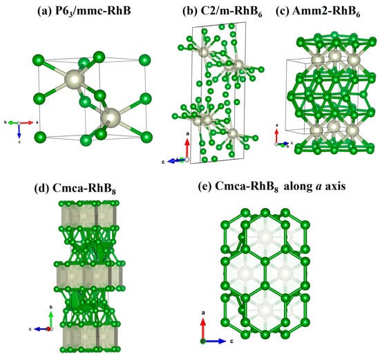 The crystal structures and atomic arrangements of predicted stable Rh-B compounds. The green balls represent B atoms, and the white balls represent Rh atoms.