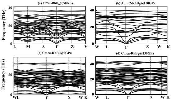 All positive phonon frequencies indicate the stability of the crystals. Phonon dispersion calculations performed via the finite displacement method confirm the dynamical stabilities of predicted RhB6 and RhB8. No imaginary modes were found in the phonon frequencies of RhB6 and RhB8 within their stability pressure ranges (Figure 4). Notably, orthorhombic RhB8 exhibited no imaginary phonon modes in the BZ at ambient pressure, suggesting its potential recoverability under ambient conditions.