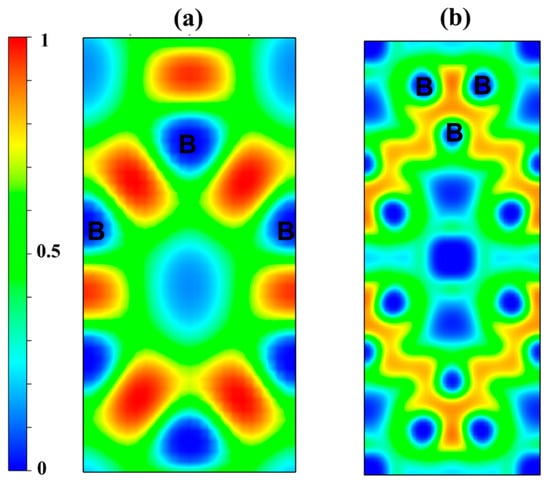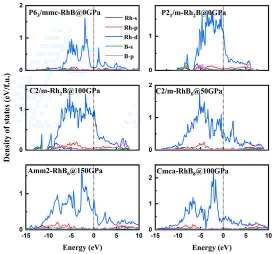 In order to investigate the electronic properties of stable Rh-B compounds, their partial densities of states (PDOSs) are investigated under pressure. As shown in Figure 5, all thermodynamically stable Rh-B phases exhibit finite densities of states at the Fermi level (N(EF)), confirming their metallic character. The density of states of Rh-d and B-2p occupied most of total density of states at the Fermi level. Moreover, the similar shapes of the density of states of these stable compounds were observed in the whole energy range, exhibiting hybridizations between Rh-3d and B-2p orbitals. Notably, stable Rh-B compounds lacked the characteristic deep pseudo gap valleys near the Fermi level, which were evidenced by their finite density of states across the entire energy range. Therefore, the relatively weak covalent bonding formed by Rh-3d and B-2p to other borides decreases their hardness. The decrease of the total DOS at the Fermi level for Amm2-RhB6 and Cmca-RhB8 is accompanied by the appearance of the pseudogap around the Fermi level, which is helpful to increase the stability of orthorhombic RhB8. To further investigate the chemical bonding in RhB6 and RhB8, electron localization functions (ELFs) were calculated to help visualize B-B bonding. A high ELF (0.5–1) indicates that the electrons are highly localized and strong covalent bonds exist, while a low ELF (0–0.5) demonstrates that the electrons are highly delocalized and ionic bonds exist. Figure 6 displayed ELFs for the (100) plane of Amm2-RhB6 and (001) plane of Cmca-RhB8 at 150 GPa. Strong covalent bonding of B-B in Amm2-RhB6 and appreciably weaker B-B bonding in Cmca-RhB8 was observed. The strong covalent bonding helps to increase the stability of RhB6 and RhB8.