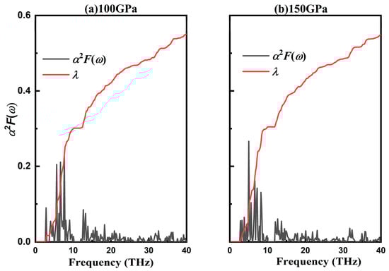 Eliashberg spectra function and electron–phonon coupling parameter at 100 GPa and 150 GPa of Amm2-RhB6.