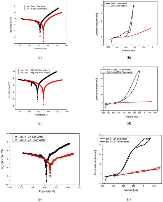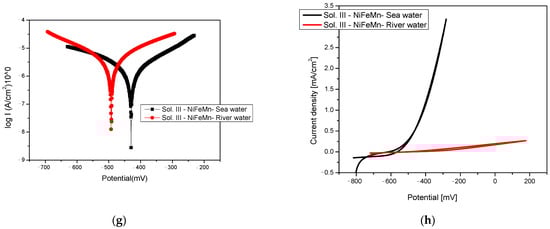 Figure 1a,b shows the polarisation diagrams for reinforcing steel obtained in both seawater and river water electrolyte solutions. For both cases, it can be observed that the anodic reaction, i.e., the oxidation of Fe—reaction (1), is predominant compared to the cathodic type—reaction (2). In these aqueous media, corrosion occurs in the presence of oxygen. The corrosion of Fe in aqueous media starts with the anodic reaction: