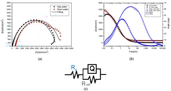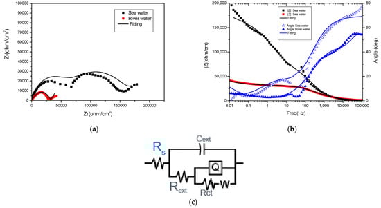 The circuit shown in Figure 2c was used for processing the EIS data obtained for the reinforcing steel samples in the river and sea water electrolytes. The impedance spectra were fitted using an equivalent circuit model (R(QR)), where Rs is the solution resistance, Q is the capacitive behaviour of the double-layer electric capacitance at the steel/solution interface and is modelled as CPE to account for actual and surface roughness, and Rext is the charge transfer resistance, which is indirectly proportional to the corrosion rate (i.e., the higher the Rp, the better the steel corrosion resistance). The solution resistance (Rs) values reflect the ionic conductivity of the test medium. Higher Rs values are observed in river water (approximately 317 Ω/cm2) due to its lower ionic content, while lower Rs values are observed in seawater (approximately 13 Ω/cm2), which is consistent with its higher salinity and ionic conductivity. The charge transfer resistance (Rext) values for the steel samples were 4655 Ω in river water and 4447 Ω in seawater. These relatively similar Rext values suggest that the initial corrosion behaviour is comparable in both environments, although slightly higher resistance was observed in river water, likely due to its lower chloride content. These results confirm that uniform corrosion predominates under the test conditions.