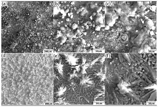 SEM images at different magnifications after the corrosion process in seawater for reinforcing steel at (a) 100×, (b) 500×, and (c) 1000× and for the solution II phosphated sample at (d) 100×, (e) 500×, and (f) 1000×.