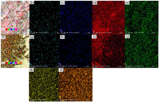 Main element distribution after the corrosion test of reinforcing steel sample: (a) elemental distribution; (b) carbon distribution; (c) chlorine distribution; (d) iron distribution; (e) oxygen distribution; and for the solution II phosphated sample: (f) element distribution; (g) carbon distribution; (h) chlorine distribution; (i) iron distribution; (j) oxygen distribution; (k) phosphorus distribution; (l) zinc distribution.