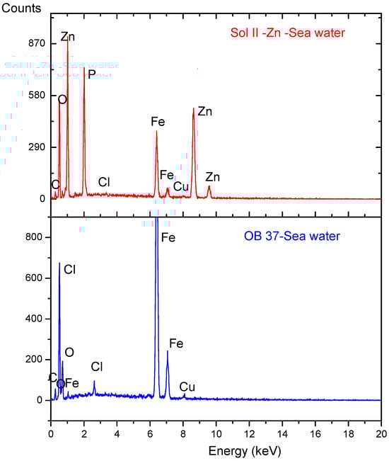 Figure 4d–f shows the SEM images of the II/Zn solution phosphated sample that showed the best corrosion resistance at different amplifications after the corrosion process in seawater. It is observed that the coating did not suffer any major damage after the corrosion test, and no corrosion marks or exfoliation were observed on the surface. The formation of micron-sized compounds on the surface during the corrosion process can also be observed in this case. The thickness of the deposited layer is ~10 μm, and that of the conversion layer is ~20–30 μm. It can be observed that the material suffered significant damage during the corrosion test, caused by the deposition of iron oxide and hydroxide corrosion compounds on its surface. From the element distribution, shown in Figure 5, the presence of chlorine and oxygen on the surface of reinforcing steel can be noted.