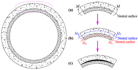 The mechanical properties of a pipe rehabilitated with mortar lining are influenced by the host pipe, the liner and their interface. The interface provides bonding that contributes to shear and tensile strength, allowing the host pipe and the liner to jointly bear external loads and undergo coordinated deformation. This configuration is regarded as a superposed structure. A part of the pipe section can be considered a curved beam, forming a superposed curved beam (SCB) after spraying, as shown in Figure 1a. If the condition of coordinated deformation is not achieved, the SCB degenerates into a composite curved beam (CCB) [21]. A composite beam refers to a beam where two materials are combined tightly but without adhesion at the interface, as shown in Figure 1b.