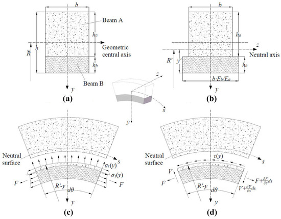 Figure 2c,d illustrate an arc micro unit on the SCB. An element below is cut from a surface at any vertical position y. Similar to the derivation of a curved beam [23], the normal stress, radial stress and shear stress in beam B () are determined, as shown in Equations (2)–(4):