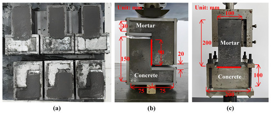 Mechanical properties of the concrete and mortar were determined through standard tests for cementitious materials. Concrete–mortar interface strength, a critical factor in evaluating interface failure, should be assessed through dedicated interface tests. Although there is a lack of relevant standards, many scholars have summarized the types and methods of interface testing [31,32].