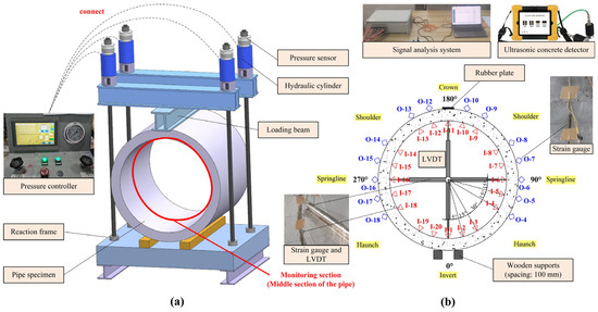 The TEB tests were carried out in accordance with GB/T 16752-2017 [35]. A suite of experimental instruments was utilized, encompassing a loading system, displacement and strain monitoring systems and a data acquisition system. The hydraulic loading system, equipped with load sensors, was capable of exerting a maximum force over 100 ton on the pipes. A W-DCS50 LVDT displacement sensors by Beijing TYHC (Beijing, China) were used, with a measuring range of −50~50 mm. The strain gauge used for concrete strain measurement was BQ120-80AA by ZEMIC (Xian, China). Data collection was managed by the DH5921B signal analysis system from DONGHUA (Jingjiang, China). An HC-U81 ultrasonic tester by HICHANCE (Beijing, China) was employed to record the cracks and measure their widths, with a sampling period of 0.025~2000 ms. Mortar spraying was facilitated by the M/P-50 system from Wuhan CUG Trenchless Technology Research Institute (Wuhan, China). The placement of the equipment is shown in Figure 4. From the invert (0°), a strain gauge was set every 15° along the circumferential direction, except at the shoulders and haunches.