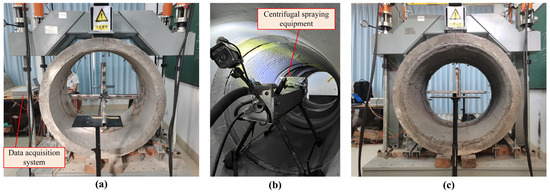 Figure 5. Pre- and post-rehabilitated RCP testing process: (a) host pipe being loaded; (b) mortar spraying; (c) repaired pipe being loaded.