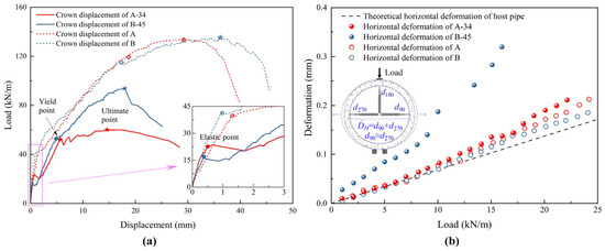 The average spray thicknesses for specimens A and B are 34 (9.21%) and 45 (18.23%) mm. As the spray thickness increases, the uniformity of the liner thickness decreases due to challenges in the spraying process and the effects of gravity, which introduce an inherent systematic error. The repaired pipes are labeled as A-34 and B-45. The load-displacement response at the crown of each pipe is shown in Figure 6a. Table 3 presents the specific values reflecting the structure performance.