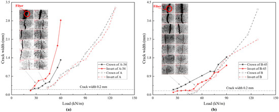 The cracks at the crowns and inverts were monitored and measured, with their propagation shown in Figure 7. Due to the influence of interface randomness, the liner cracks around the crown and invert have different development trends. For A and B, a crack with a width of 0.2 mm corresponds to the elastic limit load. However, the crack load is different for the repaired pipes: approximately 28 kN/m for A-34 and 22 kN/m for B-45, which misalign with their elastic limit loads. Thus, the elastic behavior of the repaired pipe is influenced predominately by the interfacial mechanical properties rather than by cracking. The fibers in the mortar inhibit cracking, resulting in narrower cracks than those in the concrete at the final stage.